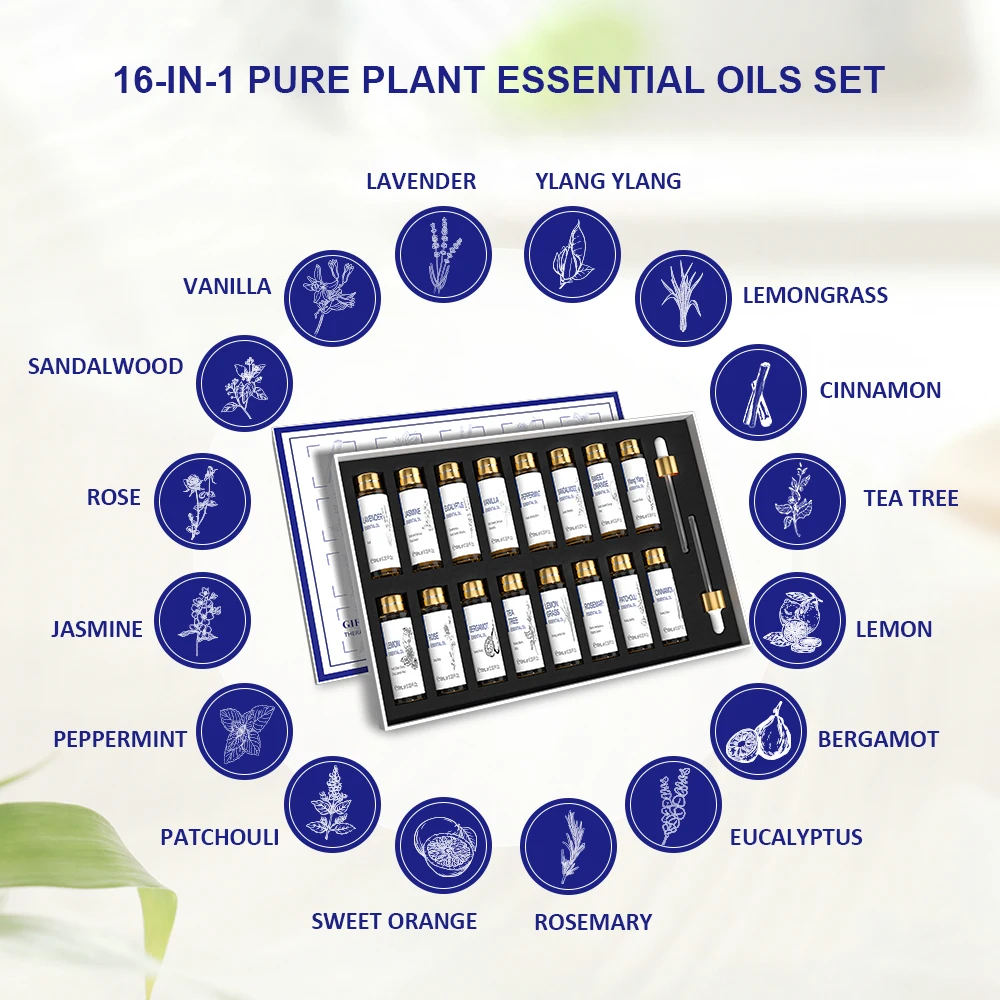 Pick out the most favorable pure essential oils from this set, treat yourself at most costable way. It includes 16 different essential oils Lavender, Jasmine, Rose, Eucalyptus, Vanilla, Peppermint, Sandalwood, Orange, Lemongrass, Bergamot, Tea Tree, Cinnamon, Ylang Ylang, Patchouli, Rosemary, Lemon.